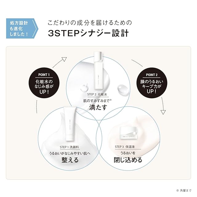 肌をすみずみまでうるおいで満たし、バリア機能をキープして変化にゆらがない肌環境に整える新成分アプローチを採用。肌のうるおいを引き出して高め、ハリ感あふれる肌へ。いつまでも調子のいい肌状態をキープします。
