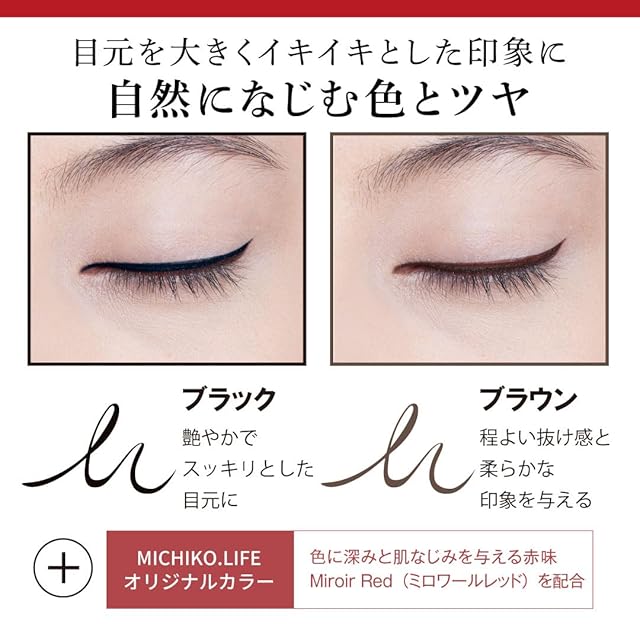 ◉色・色持ち・色づき・仕上がりの良さはもちろん、筆質や持ち手にもとことんこだわったアイライナー。目元をパッチリと大きく印象的にすることはもちろん、ハッキリなのに自然さも併せ持つ理想の仕上がりを叶えます。◉ラインメイクを制しメイクを制する。目元の輪郭を際立たせ、イキイキとした印象を与えるのがアイラインの役割。年齢とともに、小さくぼやけた印象になってしまう目元にこそ、アイライナーは大切なアイテムです。描きやすさや使い心地にまでこだわった、MICHIKO.LIFEメイクコントロールライナーでワンランク上の目元印象に。◉『メイクコントロールライナー』=「リキッドアイライナー」+「ペンシルアイライナー」+「ジェルアイライナー」。様々な種類のアイライナーの良いとこ取りをした理想形を目指し、こだわりを詰め込みました。◉『メイクコントロールライナー』が追い求めたのは、「深みのある色」、「上品で端麗な仕上がり」、「圧倒的な描きやすさ」、「キレイ長持ち」◉深みと肌なじみを与えるMiroir Red(ミロワールレッド)。MICHIKO.LIFEオリジナルカラーとして、2色共通して、赤みを与える成分(※1)を配合。色に深みと肌なじみを与え、よりイキイキとした印象に。(※1 赤226(着色剤))◉にじまず色移りしにくい速乾処方。さらにキレイに描いたアイラインをしっかりキープできるストレッチポリマー(※2)と3つのプルーフ機能で、汗・涙・皮脂・こすれに強く長時間キープ。なのに、ツッパリ感・パリパリ感がない使用感にもこだわりました。(※2 (スチレン/アクリレーツ/メタクリル酸アンモニウム)コポリマー、アクリレーツコポリマーアンモニウム(すべて基材))◉藤原美智子が理想とする肌あたり、液含み、筆のコシを世界に誇る熊野の筆職人の手揉み技術によって形にした国産オリジナル筆。長さや太さの異なる3種の毛質をブレンド。◉ラインをひく手元の安定、描き心地、持ちやすさについてもこだわり、手になじみ安定して描ける重厚感ある八角形軸を採用。