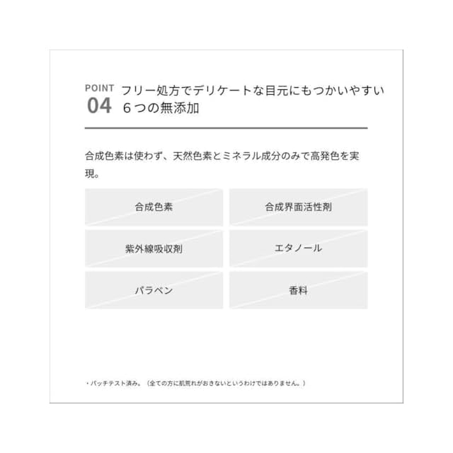 【ご使用上の注意】お肌に異常が生じていないかよく注意してご使用ください。お肌に合わない時はご使用をおやめください。傷、はれもの、湿疹等、異常のある時はご使用をおやめください。ご使用中、赤み、はれ、かゆみ、刺激、色抜け(白斑等)や黒ずみ等の異常があらわれた場合やご使用した肌に直射日光があたって上記のような異常があらわれた場合は、ご使用を中止してください。そのままご使用を続けますと、症状を悪化させることがありますので、皮膚科専門医等にご相談されることをおすすめします。目に入った時はすぐに洗い流してください。製品の特性上、芯が折れやすくなっています。使用時は芯を長く出しすぎないようにご注意ください。乳幼児の手の届かない所に保管してください。落下により芯が折れる場合がありますのでお取り扱いには十分ご注意ください。直射日光や極端に高温または低温の場所には保管しないでください。パールの流れが模様のように表面に浮き出ることがありますが品質上問題はございません。気温による温度変化により表面に油滴があらわれることがありますが、植物油等が温められてにじみ出たもので品質上問題はございません。