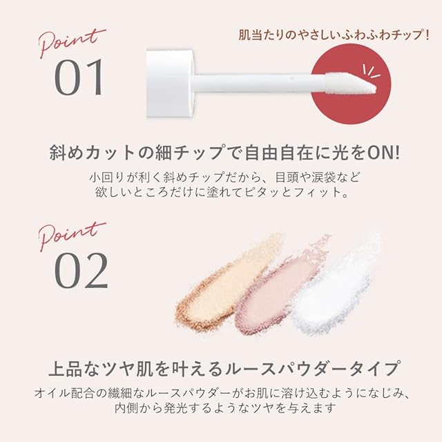 チップで乗せる、柔らかな透明感!オイルinパウダーの極上ツヤ肌ハイライト。上品なツヤ肌を叶えるルースパウダータイプ。オイル配合の繊細なルースパウダーがお肌に溶け込むようになじみ、内側から発光するようなツヤを与えます。