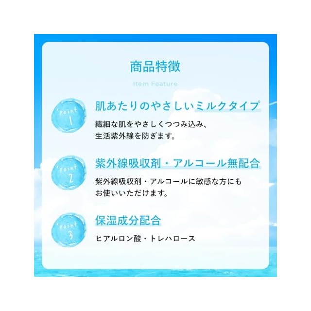 【やさしい使い心地の日焼け止めミルク】しっとりとしたミルクタイプの日焼け止め。乾燥しがちな肌にもするんとなじみ、うるおいを与えます。ちふれスキンケアと同じ保湿成分配合(ヒアルロン酸・トレハロース)*。紫外線吸収剤不使用・アルコールフリーで、紫外線吸収剤やアルコールに敏感な方にもご使用いただけます。<br>*全てのスキンケアに配合しているわけではありません。