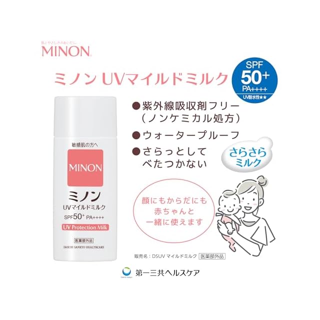 ミノンUVマイルドミルクは汗・水につよく、全身に使えるウォータープルーフ。さらっとべたつかず、紫外線を防いでうるおう独自処方。親子で同じ日焼け止めを使用したい方や、UVカット効果が高い日焼け止めをお探しの方へ