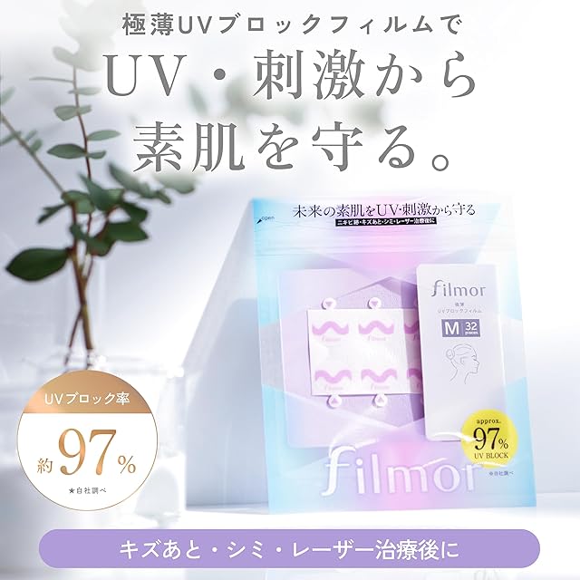 【UV・刺激から素肌を守る】 filmorはUVを約97%カットしてキズあと・シミ・レーザー治療後の肌を守る"貼るUVケア"の極薄UVブロックフィルムです。パッチタイプだから気になる箇所をピンポイントケア。