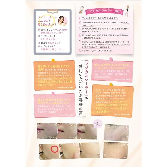 UVや化粧下地を塗った後、お顔の気になる部分をマジカルシーラーでカバーし、その上からパウダーかファンデーションで仕上げて下さい。