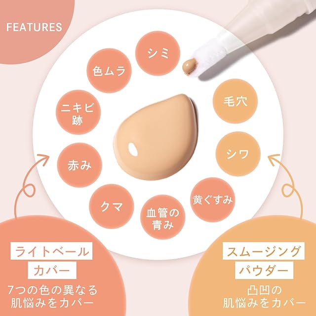 肌に密着し、自然な仕上がりが持続するコンシーラー。ライトベールパウダー*1の働きで、気になる肌悩みをカバー※。また、肌に艶を与える“WHITE377*2”や黒ショウガエキス*3も配合。