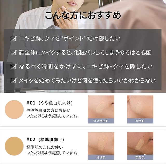 【日本人男性に合わせた色味】男性専用のメイクアップアーティスト監修のもと、日本人男性に合うように作られています。#01は、やや明るめの肌色向け。#02は、標準の肌色向け。