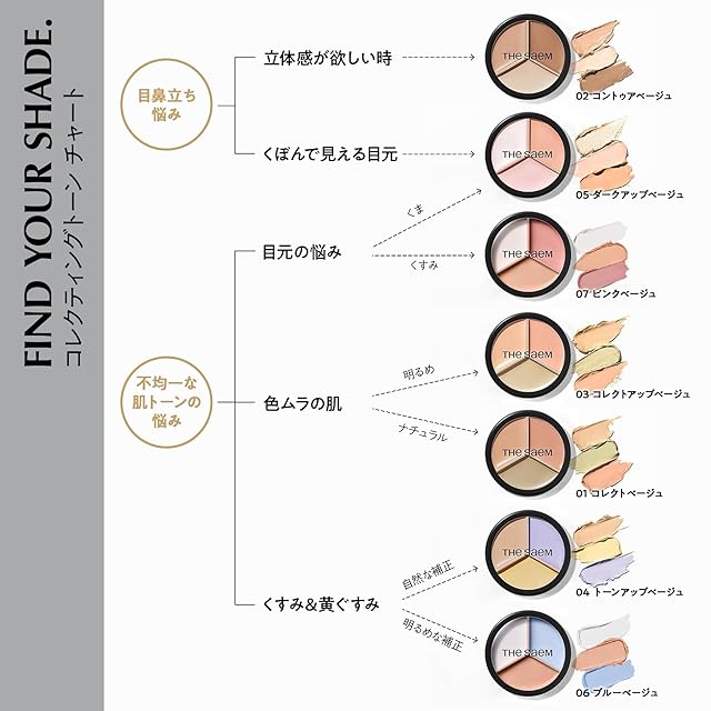 様々な肌の欠点にあわせて、細分化された3色が、気になる部分をカバー