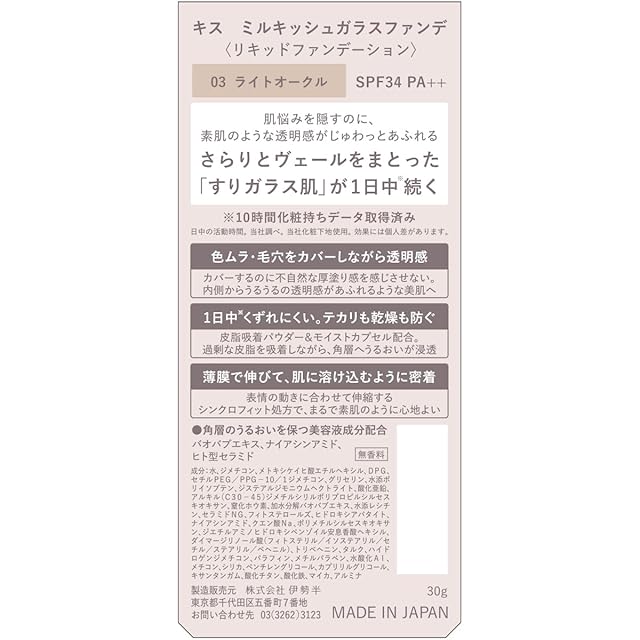 KiSS(キス) ミルキッシュガラスファンデ 03 ライトオークル 30g 色ムラ・毛穴カバー SPF34・PA++ 美容液成分配合
