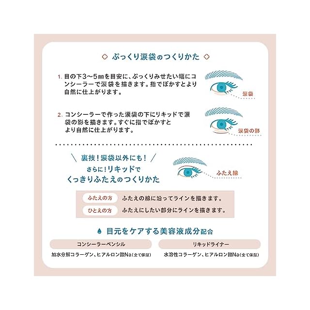 <クリームベージュ><br> ○目元美容液成分配合<br> コンシーラーペンシル:加水分解コラーゲン、ヒアルロン酸Na(全て保湿)<br> リキッドライナー:水溶性コラーゲン、ヒアルロン酸Na(全て保湿)<br> ○テクニックいらずぷっくり涙袋