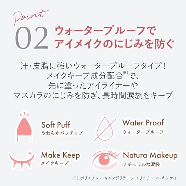 ☑アイメイクのにじみを防ぐ。汗・皮脂に強いウォータープルーフタイプで長時間涙袋をキープ。メイクキープ成分配合で、先に塗ったアイライナーやマスカラのにじみを防ぎ、1日中パンダ目をブロックします。