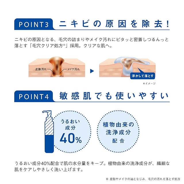 ニキビの原因となる毛穴の詰まりとメイク汚れにピタッと密着して落とす「毛穴クリア処方」を採用。何度も肌をこすらなくてもメイク汚れをするんと落とします。