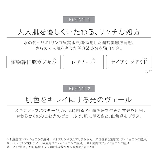 【全成分】リンゴ果実水、シクロペンタシロキサン、酸化チタン、トリメチルシロキシフェニルジメチコン、BG、酸化亜鉛、PEG-10ジメチコン、ペンチレングリコール、セスキイソステアリン酸ソルビタン、オレイン酸ソルビタン、水酸化Al、スピルリナマキシマエキス、エリンギウムマリチムムカルス培養液、アセチルヒアルロン酸Na、加水分解ヒアルロン酸、ヒアルロン酸Na、ヒアルロン酸ジメチルシラノール、スクワラン、ポリクオタニウム-61、加水分解卵殻膜、コルクガシ樹皮エキス、(メタクリル酸グリセリルアミドエチル/メタクリル酸ステアリル)コポリマー、パルミチン酸レチノール、ナイアシンアミド、グリチルリチン酸2K、ユビキノン、アンズ核油、コーン油、グリセリン、エチルヘキシルグリセリン、ヒドロキシアパタイト、トマト果実/葉/茎エキス、ローズマリー葉エキス、ヒマワリ種子油、アルギン酸Ca、アラントイン、イソステアリン酸、レシチン、メチコン、炭酸プロピレン、硫酸Mg、カプリル酸グリセリル、ジミリスチン酸Al、DPG、パルミチン酸エチルヘキシル、塩化Na、アルミナ、ラウロイルリシン、ジステアルジモニウムヘクトライト、窒化ホウ素、シリカ、含水シリカ、ジメチルシリル化シリカ、スクロース、酢酸セルロース、フェノキシエタノール、トコフェロール、マイカ、タルク、合成フルオロフロゴパイト、ハイドロゲンジメチコン、酸化鉄