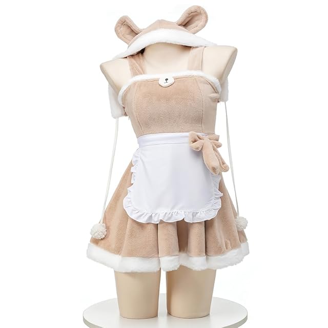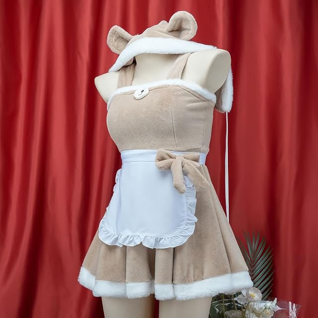 商品名:[YAISHN] 熊 熊耳 コスチューム セクシー 猫 ネコミミ メイド服 エプロン コスプレ ワンピース 茶色 過激 ベビードール ランジェリー エッチ エロい 可愛い 調教 露出 へそ出し ブラウン 3点セット