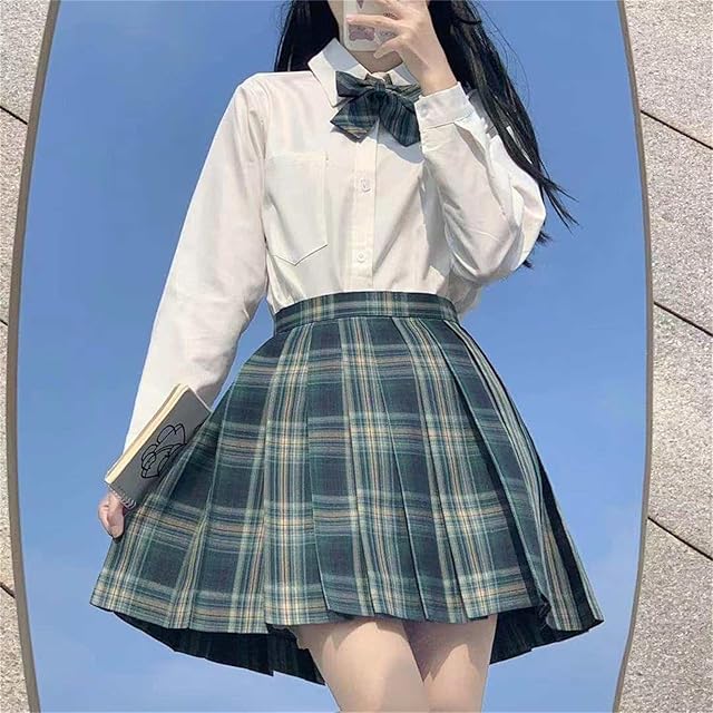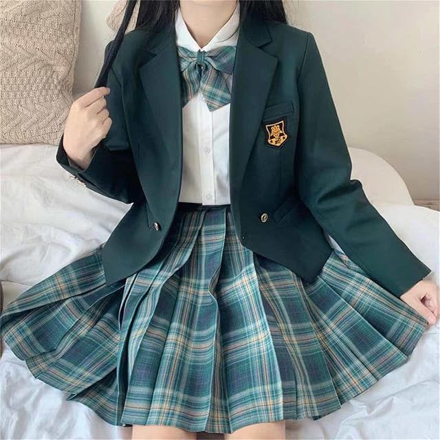 [QOOLYㅤ] 女子高生 制服 コスプレ 学生服 ブレザー チェック柄 プリーツスカート リボン シャツ バッジ 5点セット 女の子 高校生 JK制服 スクール ジャケット スクールスーツ コスチューム 仮装 卒業式 入学式 春 夏 秋 冬 green L