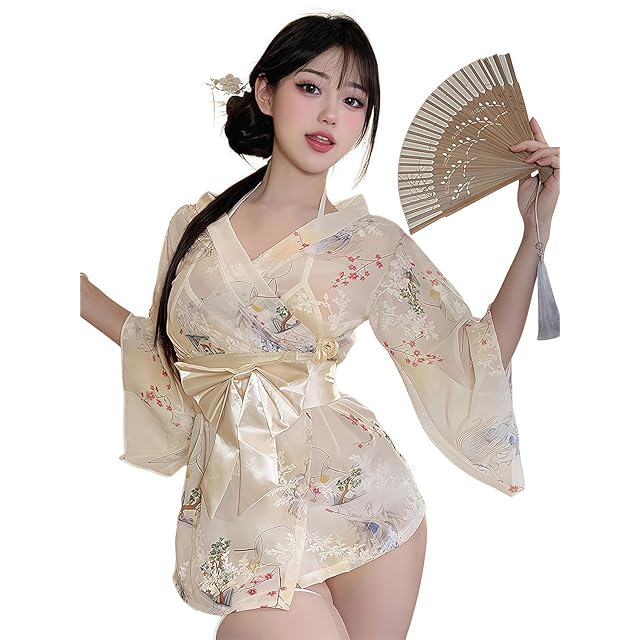 [SENMHS] セクシー 浴衣 コスプレ 着物 和風 ランジェリー 4点セット [ベルト+ブラ+ガウン+Tバック] フリーサイズ cosplay コスチューム ベビドール 可愛い 前開き 可愛い和装スタイル (ベージュ)