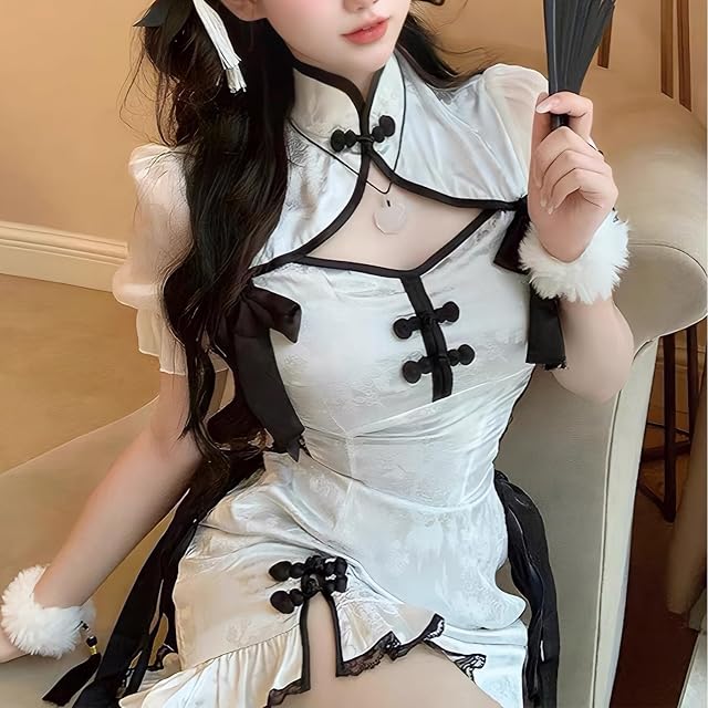 [Soxeeh] チャイナ服 チャイナドレス コスプレ メイド服 セクシー コスチューム チャイナ風 胸空き 萌え 可愛い 誘惑 仮装 Tバック付き 2点セット(ホワイト)