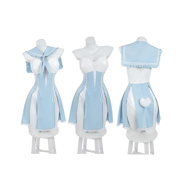 【魅力的なデザイン】:清らかセーラー風に、さわやかスカイブルー。ハート形のふわもこテイルに、こだわりレースアップ! 少女心くすぐる、青春あふれるバニーガールコスチューム登場!