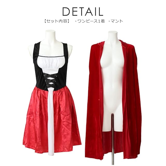 中世のドレスのようなクラシカルな雰囲気が可愛い。短すぎないスカート丈がこだわり。全体のシルエットがガーリーに見えるようこだわりました。コルセット風の装飾やマントなどこだわりのデザイン。ガーリーでありながら大人っぽさもある少し個性的な赤ずきん衣装テーマパークやハロウィン、コスプレ、仮装パーティにはもちろん、結婚式の余興やイベントなどにも使えます!
