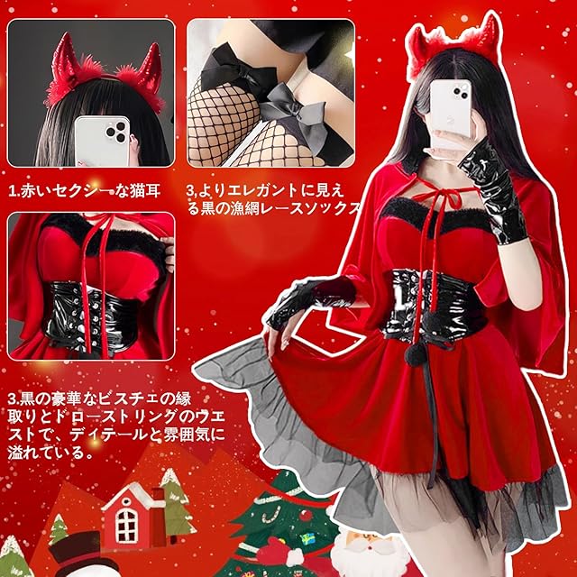 商品名:[TUAHOUS] サンタ クリスマス コスプレ レディース ワンピース ロングストール付け 御姉風 小悪魔 悪魔の角 可愛い 変装 手袋 カチューシャ セクシー サンタクロース