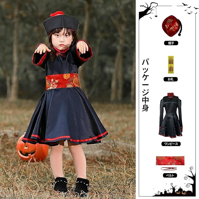 【キョンシーコスプレ衣装】:パッケージ中身はワンピース、帽子、ベルト、お札の4点セットです。中国清朝の立体官帽、襟元の赤いレトロなボタン、ベルトに中国風の刺繍プリントと、独特の肩出しデザインは程よくセクシーで女の子にぴったりです。このゾンビ衣装はレトロな雰囲気にあふれ、ハロウィンの恐怖の雰囲気を高めます。