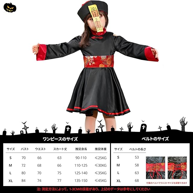 【キョンシー コスプレ レディースのサイズ】:ワンピース:Mサイズ、バスト72CM、ウエスト66CM、スカート丈66CM、推奨身長110-125CM、推奨体重:30KG内の女の子 ベルト:Mサイズ、60CM(ウエストはベルト付きで調整可能) 注:測定方法によって、1-3CMの誤差があり、上記のデータは参考にしてください。