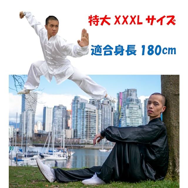 カンフーコスプレ衣装の出品です。<br> 適合身長は180cm。XXXLサイズ。大きい方用。<br> カラーは青・黒・赤・黄・白の5色(無地)。<br> 棒ボタンシャツとパンツのセットです。<br> シャツは縦開きでボタンは棒ボタン<br> (紐の先の団子にもう一方の紐の輪っかを引っ掛けて止めるタイプ)。<br> 袖口はひもでしめます。足首はゴムでしまります。<br> 素材はポリエステルです。<br> 功夫・中国拳法・太極拳等の演劇・舞台・パフォーマンス。<br> 本格的な武術服・練習着(服)としてトレーニングにも使用出来ます。<br> <br> 梱包サイズ<br> 27*17*6cm<br> 360g<br>
