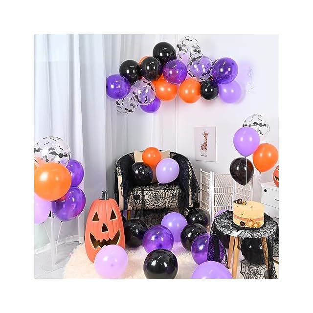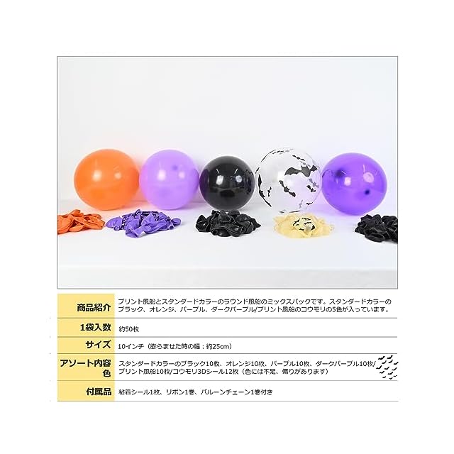 ■ポピュラーなラウンド風船50個入りのミックスバルーンパック。鮮やかなブラックとオレンジ、パープルを基調とした配色はハロウィン限定で、目を惹くホリディ気分が盛り上がっていきます。