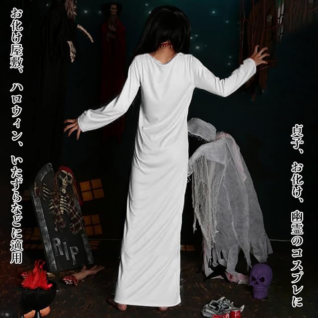 【ハロウィン、いたずらなどにピッタリの定番商品!】:貞子のコスプレ仮装は、長い黒髪で顔を隠し、白いローブに合わせて、恐怖と神秘の雰囲気を演出することができ、ハロウィン、余興、学園祭、お化け屋敷、コスプレや仮装イベントなどで活用されます。