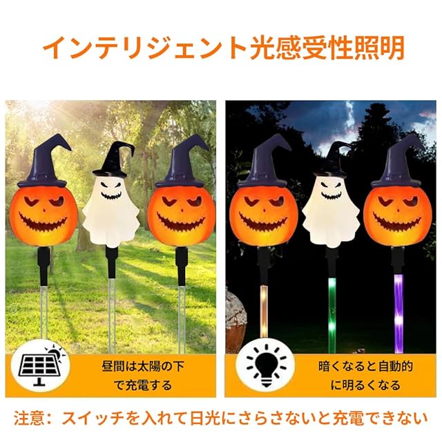 設置したソーラーハロウィンライトを土壌に差し込むだけ。日中はスイッチ「on」を入れて、 太陽電池パネルは、朝直接日光にさらされると充電されます。光センサーを内蔵し、暗くなると太陽の光が自動的に開く。