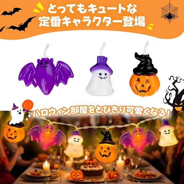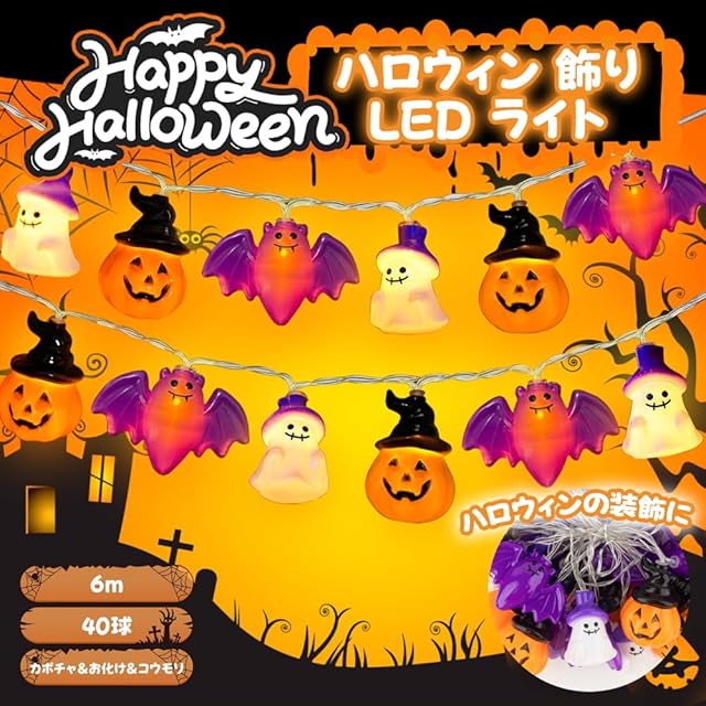 商品名:ハロウィン 飾り カボチャ お化け コウモリ ライト【40球全長6M 電池式 点灯パターン8種類】 LED ライト かぼちゃ Halloween LED装飾 パンプキン 幽霊 バット ハロウィングッズ 装飾 ストリングライト ランタン イルミネーション 吊り下げ おしゃれ 人気 装飾 雑貨 部屋 防水加工 室内/屋外に適用(40球全長6M)
