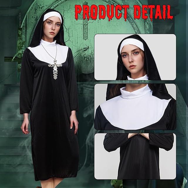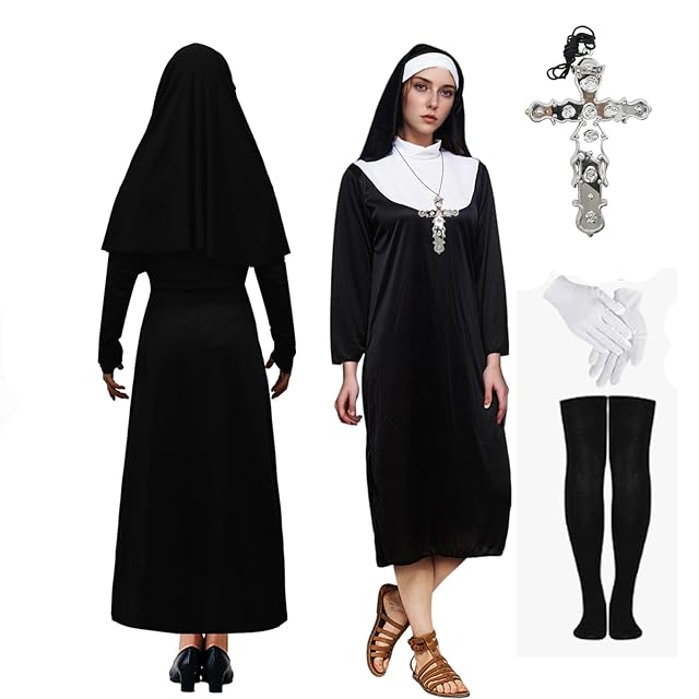 【セット内容】 このコスプレセットは、伝統的なスタイルが特徴です。十字架ネックレス、シスター服、ヘッドカバー、ベルト、ロングストッキング、グローブがセットになっており、簡単に伝統的なスタイルを演出できます。細部までこだわり抜かれたデザインが、ステージやパーティーで注目を集めます。