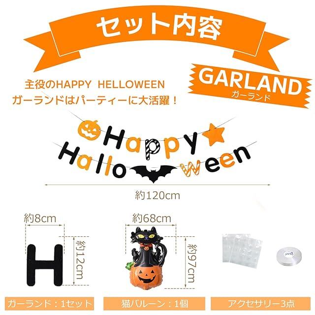 ■商品内容:HAPPY HALLOWEEN ガーランド1セット、猫のバルーン1個、10インチバルーン20個、紙吹雪風船5個、リボン1卷、ドットシール2枚。