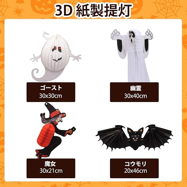 紙提灯はすべて3D型デザインで、立体的で目を引く独自のハロウィン装飾です。パーティーの天井や壁に吊り下げて、独特な雰囲気を演出できます。