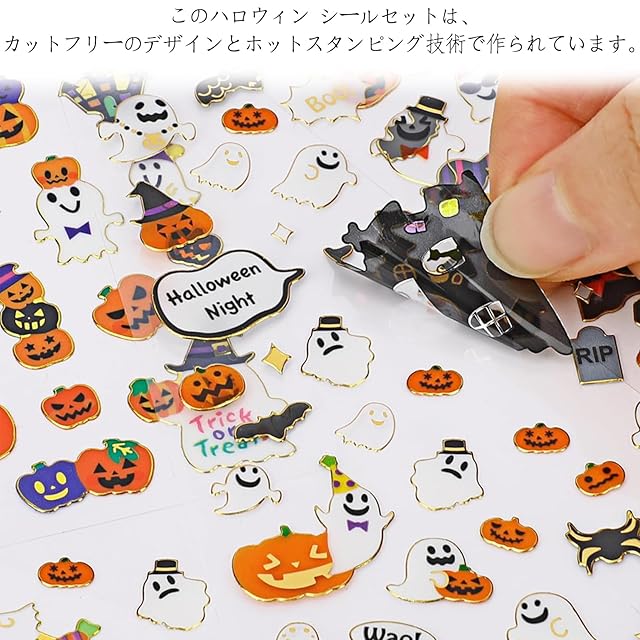 【使いやすい】このハロウィン シールセットは丈夫な紙素材で作られ、粘着性が高いだけでなく、防水性があります。このハロウィン シールセットは、カットフリーのデザインとホットスタンピング技術で作られています。ホコリや水などの影響でハロウィン シールの粘着力が下がるかもしれないので、使用前に貼り付けたいところの表面をきれいにしてください。