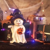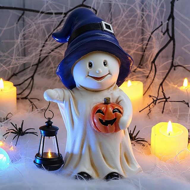 【ハロウィン飾り】ハロウィンの夜、月明かりが森を包み込む頃、奥深くの神秘的な一角に、優しげな幽霊さんがランタンを手に勇敢な子どもたちを待っています。純白のマントとブルーの魔法使い帽子を被ったその姿は、どこか神秘的でありながらも愛らしさに溢れています。ふんわりとした笑顔の下で、古びたランタンからこぼれる温かな灯りが、目の前の小道を優しく照らし出しています。