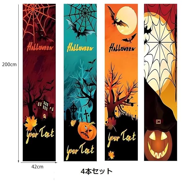 商品名:siawadeky ハロウィン タペストリー 4本セット 壁掛け 背景布 飾り付け カボチャ 蜘蛛の巣 コウモリ 枯れ木 背景バナー デコレーション 装飾 Happy Halloween ハロウィングッズ インテリア お店 部屋 窓 玄関 屋外 庭 パーティ 装飾布