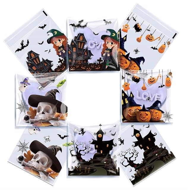 パッケージ内容:ハロウィン柄の自己接着ラッピング袋200枚セット、4種類のデザインをミックス