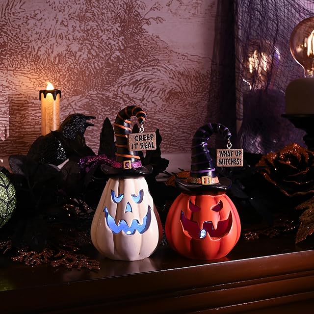 【精巧な作り】オレンジ色のカボチャは夜の闇に知性の光を宿した瞳で「WHAT UP WITCHES?(魔女たちよ、ご機嫌いかが?)」と囁いているかのようです。そして、その相棒である白いカボチャはさらに謎めいた表情を浮かべています。下がっているタグには「CREEP IT REAL(本気で不気味に!)」と書かれており、通り過ぎる人々に「今夜のハロウィンでは、すべてが不思議で不気味になる」とささやきかけているようです。