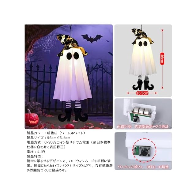商品名:ハロウィン ゴーストライト ウィッチゴースト 装飾ライト LED電球付き 電池式 パーティー飾り ハロウィングッズ 装飾 ストリングライト 恐怖の雰囲 DIY 屋外 室内 お化け屋敷 庭 寝室 玄関 風景装飾 店舗装飾 照明飾り Halloween