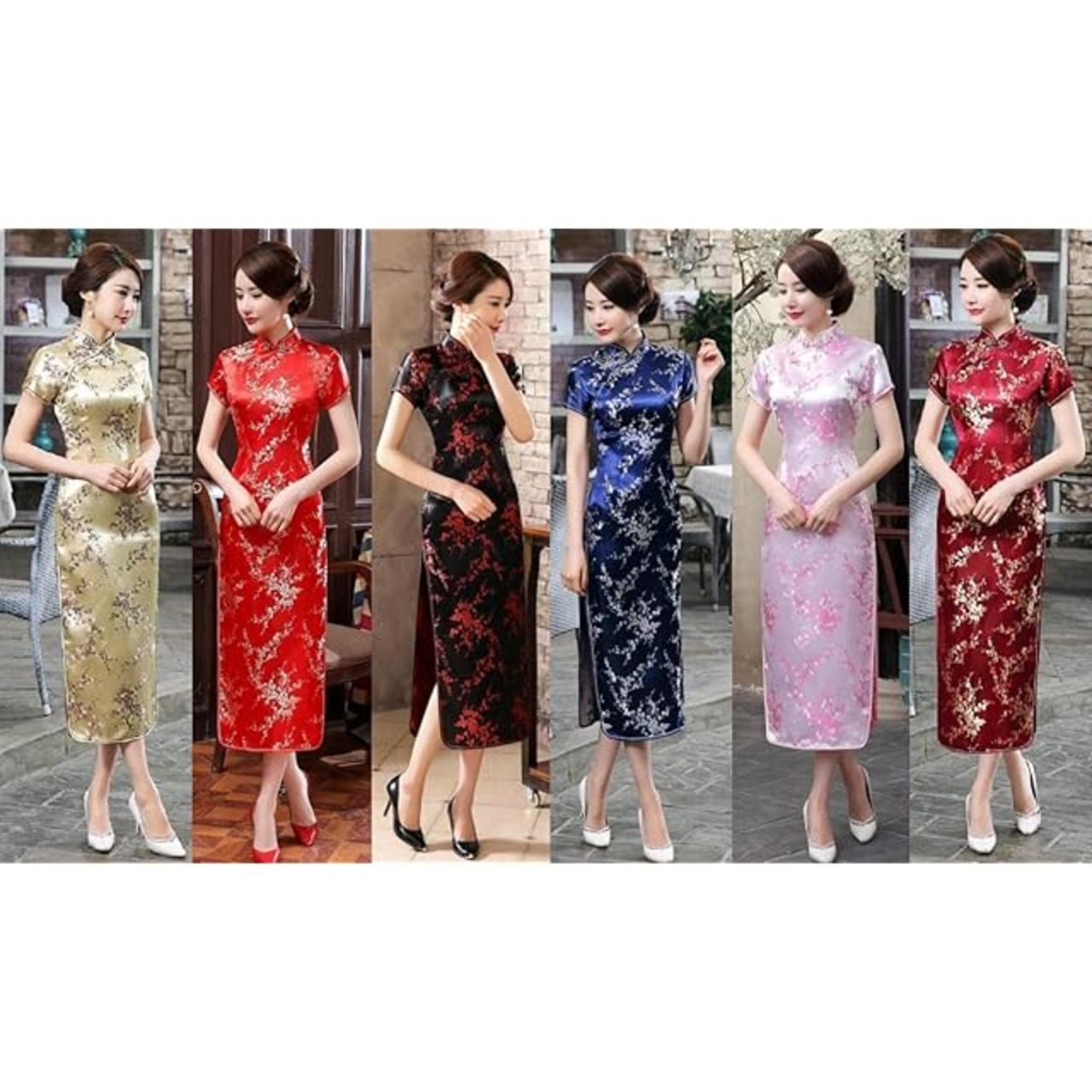 カラーバリエーション豊富なロング丈チャイナドレス。人気商品につきカラーバリエーション追加いたしました、ゴールド、赤、黒、青、ピンク、赤紫、の6色で展開しております。