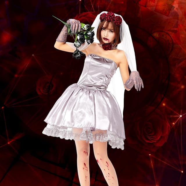 【魅惑的な雰囲気】ホワイトベールに包まれたような姿は、別世界から現れた花嫁のようです。ドレスからのぞく肌の一部や、血のようなアクセントは、ファンタジーでありながら魅惑的な雰囲気を醸し出し、見る者を惹きつけます。