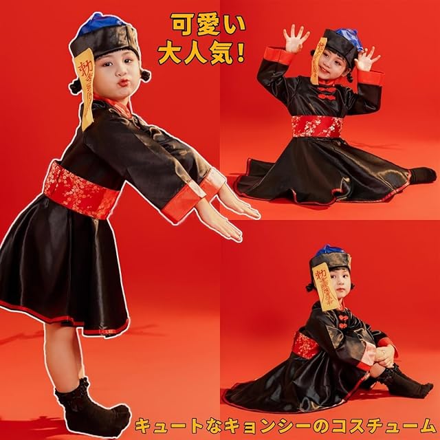 商品名:[JUNDOMECY] ハロウィン 衣装 子供 キョンシー コスプレ 女の子 5点セット チャイナ ゾンビ チャイナ服 可愛い レッド ブルー キッズ コスチューム ホラー おもしろ ペア ワンピース イベント 文化祭 演出服 (レッド, 130cm)