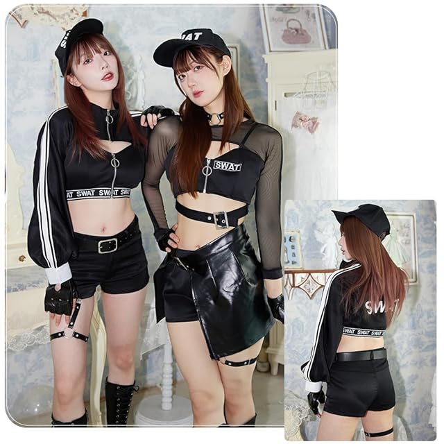 2つ目は、オーバーサイズの短丈ジャケットが目を引くジャケットタイプ。ショートパンツとのセットで、ストリート感のあるSWATスタイルを表現できます。どちらのスタイルも、手錠や帽子、レザー調の手袋など、細かなアクセサリーが充実しており、本格派の方にも満足いただける仕様。フェスやダンスイベント、撮影会、ハロウィンの仮装など、強さと美しさをアピールしたい場面にぴったりのコスチュームです。