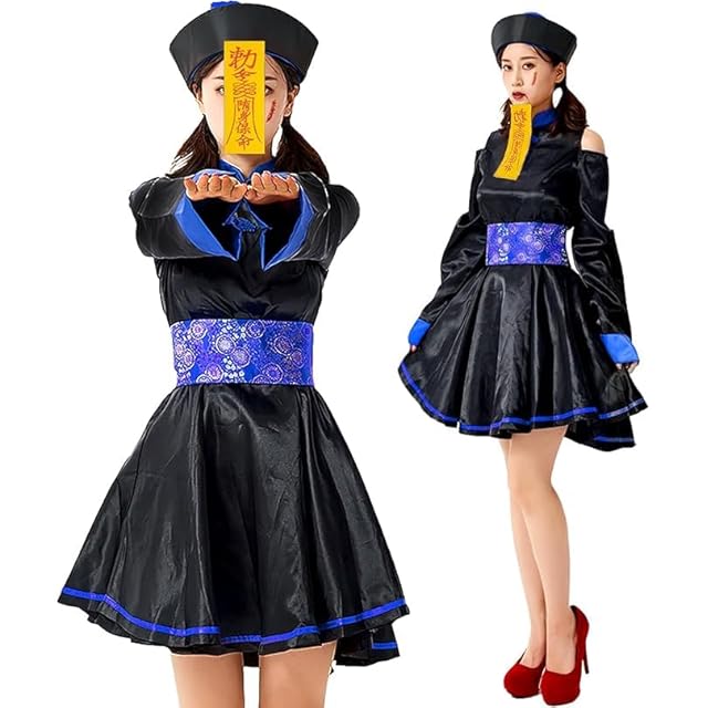 キョンシー コスプレ衣装です。黒×赤、黒×青の鮮やかなコントラストが目を引く、中華風モダンなワンピースとお揃いの帽子、腰帯、お札、タトゥーシールがセットになった本格派コスチューム。サテン調ポリエステル素材を採用し、軽やかな着心地ながら高級感を演出。肩開きデザイン&フレアスカートで、女性らしさを残した妖艶なシルエットに仕上げました。