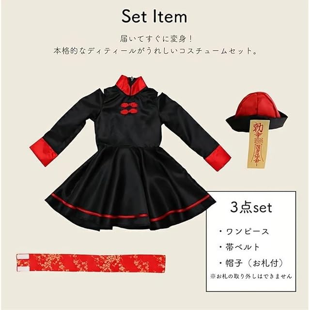【4点セット内容】帽子、お札、ワンピース、ベルト。妖怪キョンシーのコスチューム。サテン生地のワンピースに帯、お札のついた帽子がセットになった本格的な衣装となっています。可愛いワンピースタイプであっという間に可愛いミニキョンシーに変身。帽子のお札は取り外し可能。家族でおそろいコスチュームもおすすめです。