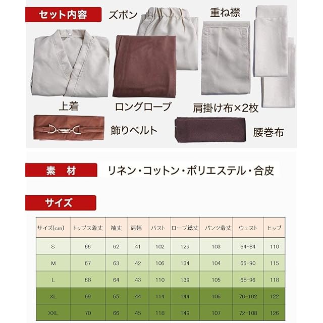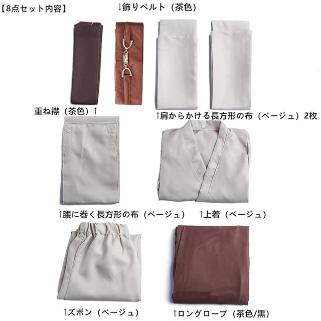 【8点セット内容】重ね襟(茶色)+上着(ベージュ)+肩からかける長方形の布(ベージュ)×2枚+腰に巻く長方形の布(ベージュ)+ズボン(ベージュ)+ 飾りベルト(茶色)+ ローブ(茶色/黒)の計8点のセット