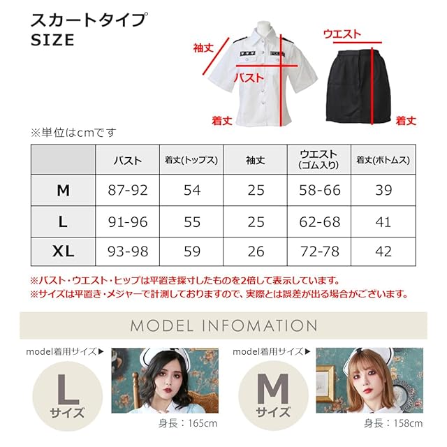 サイズ:「スカートタイプ」【Mサイズ】バスト:87-92 着丈(トップス):54 袖丈:25 ウエスト:58-66 着丈(ボトムス):39 【Lサイズ】バスト:91-96 着丈(トップス):55 袖丈:25 ウエスト:62-68 着丈(ボトムス):41 【XLサイズ】バスト:93-98 着丈(トップス):59 袖丈:26 ウエスト:72-78 着丈(ボトムス):42 「ワンピースタイプ」【Mサイズ】バスト:81-86 ウエスト:72-77 着丈:77 袖丈:17 【Lサイズ】バスト:85-90 ウエスト:75-80 着丈:80 袖丈:18 【XLサイズ】バスト:93-98 ウエスト:81-86 着丈:87 袖丈:19 ※バスト・ウエストは平置き採寸したものを2倍して表示しています。 ※サイズはすべてCM(センチ)表記です。 ※サイズは平置き・メジャーで計測しておりますので、実際とは誤差が出る場合がございます。