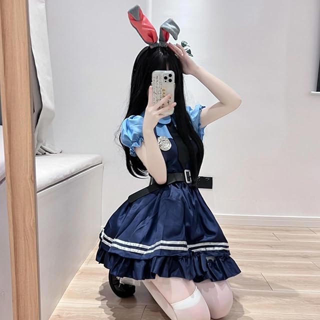[Angenster] ハロウィン コスプレ ウサギ警察 可愛い ポリス コスプレ衣装 5点セット(髪飾り+ワンピース+ベルト+ネクタイ+バッジ) 大人用 アニメ コスプレ レディース 変身 仮装 警察官 文化祭 演出服 学園祭 イベント クリスマス 誕生日 プレゼント (L(大人用))