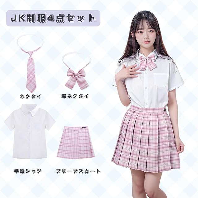 [Joyesplay] 制服セット スカート jk コスプレ プリーツスカート 4点セット シャツ チェック柄スカート 同柄リボン 女子高校生 コスプレ スクール制服 高校生 スクール制服 イベント (ピンクの乙女心-半袖, M)
