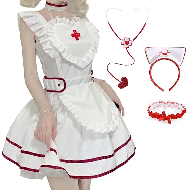 【商品8点セット内容】: ワンピース+取り外し可能な袖*2点+カチューシャ+レッグリング*2点+おもちゃの聴診器+レースニーハイタイツ. コスプレに必要なものが全てセットになっており、お手軽に可愛いナースに変身できます。人気のナースコスプレを気軽に演出できます。